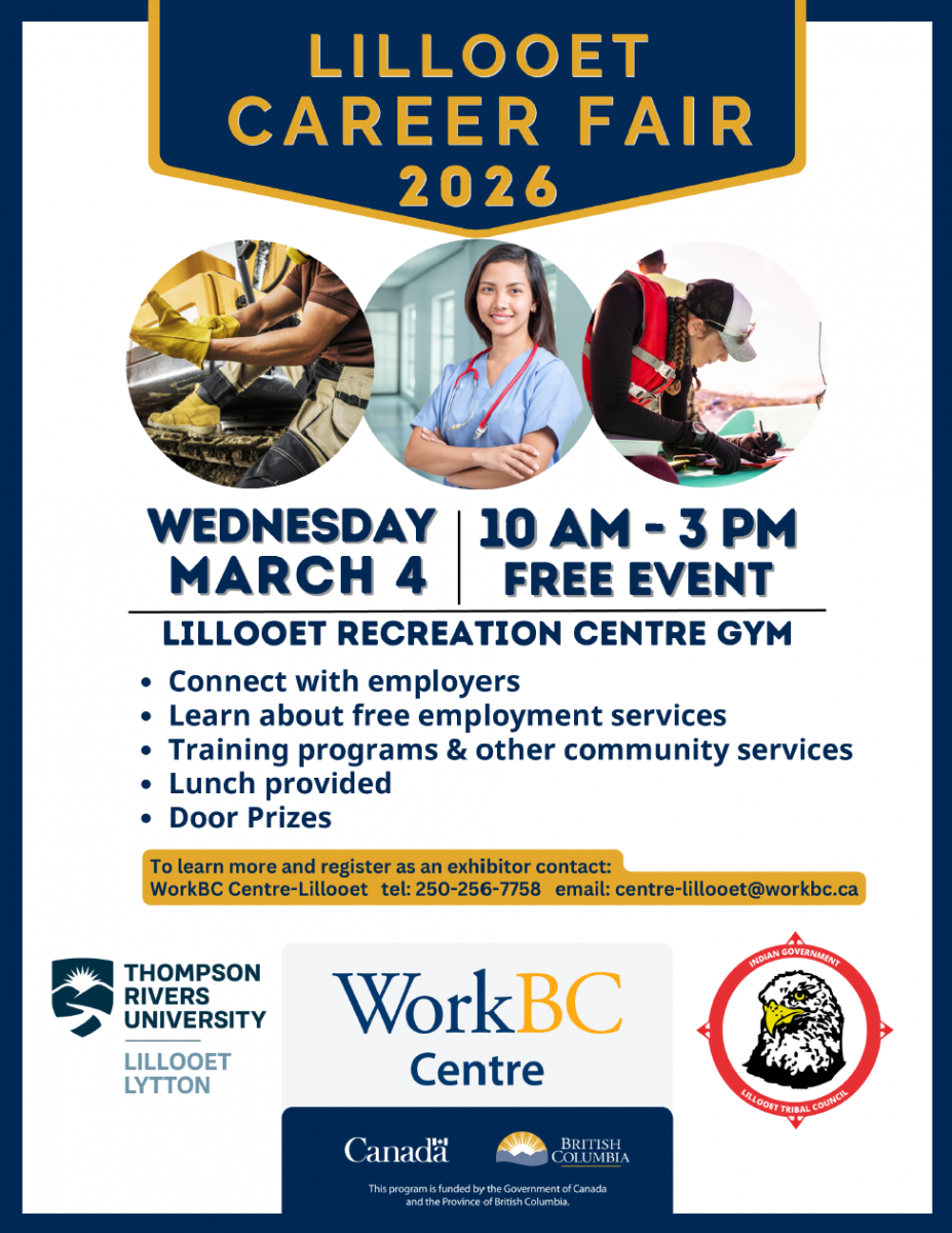 WorkBC Centre Lillooet is partnering with Lillooet Indigenous Skills & Employment Training Program / Lillooet Tribal Council and Thompson Rivers University Lillooet campus to present a Career Fair on March 4, 2026.